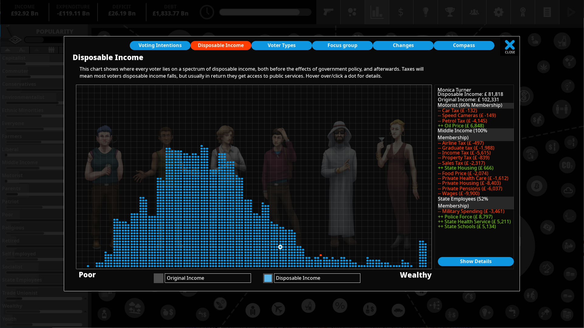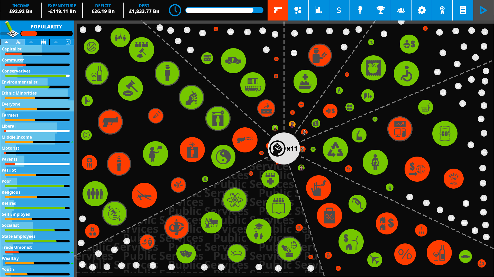 Completely revamped user-interface, using crisp vector graphics! Icons resize on the main screen to show popularity / finances / influence or values. Policy areas resize dynamically. New screens show voter finances in-depth and tons more improvements to the UI |